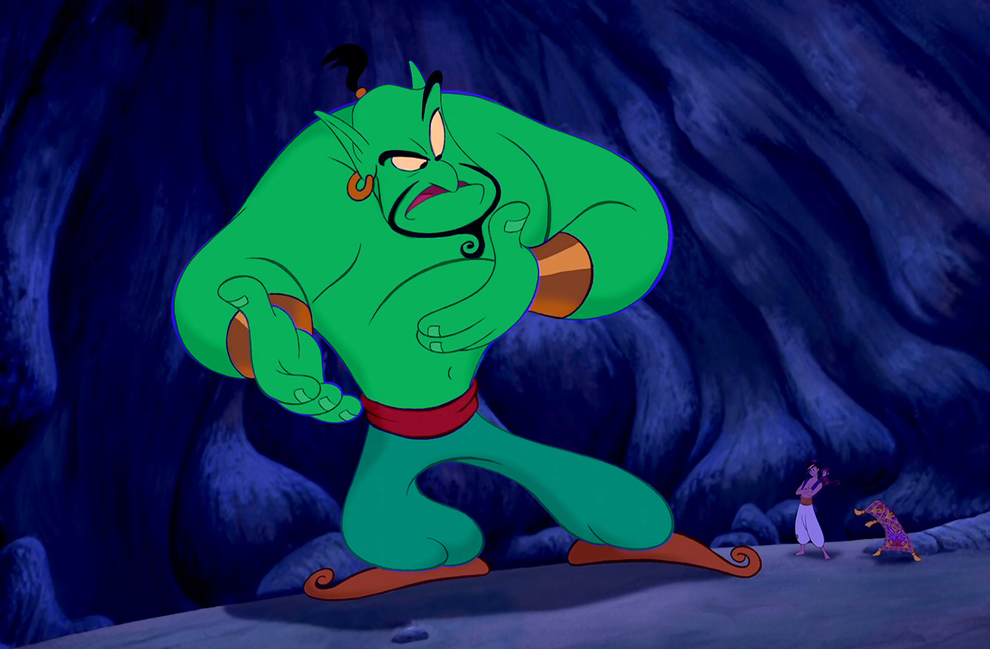 The Genie is the tritagonist of Disney's 1992 animated feature film Aladdin.He is a larger-than-life jinn residing in a magic oil lamp originating from the Cave of Wonders.For thousands of years, the Genie served as a slave to whomever held ownership of his lamp, to which he was eternally bound unless granted freedom by a master.
