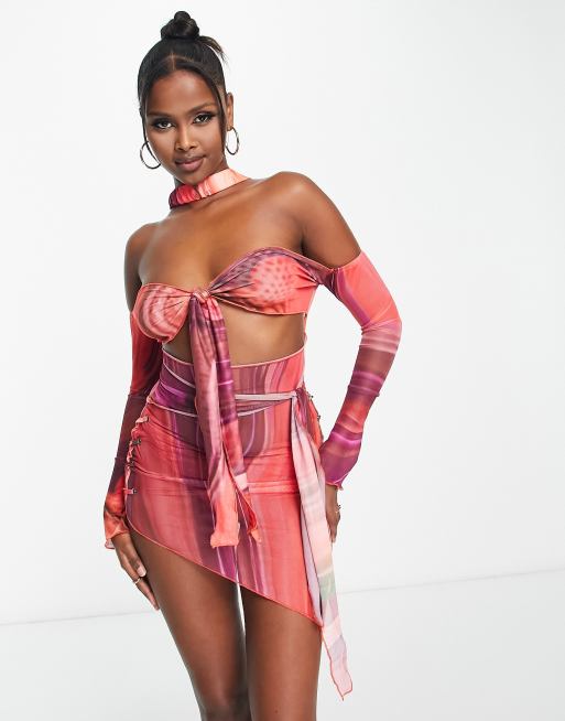 Bad Society Club Vorne gebundenes BodyconKleid aus Netzstoff in RotBunt mit Zierausschnitten