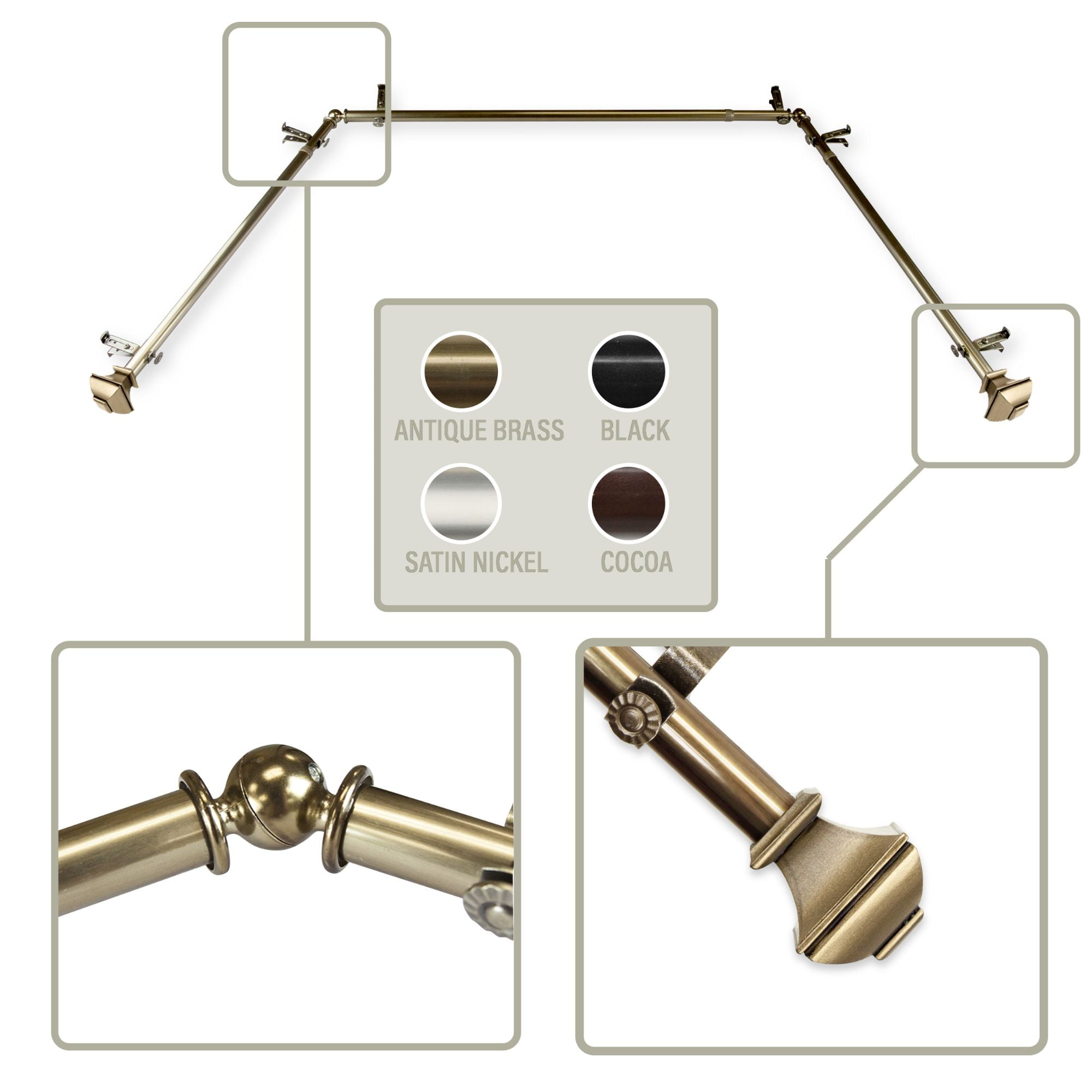 Hart & Harlow. Pandora 4-Sided Double Bay Satin Nickel Steel Bay Window Curtain Rod with Finials. Color: Black. Hart & Harlow. Parker 13/16-in Bay Black Steel Bay Window Curtain Rod with Finials. Color: Black. Hart & Harlow. Bessie 13/16-in Bay Window Curtain Rod 20-in-36-in, 38-in-72-in - Black. Color: Antique brass.