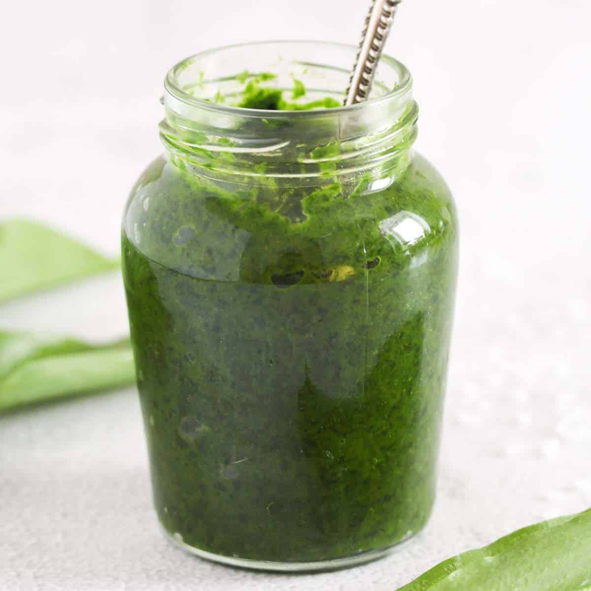 Wash and dry the garlic leaves. The easiest way to dry the leaves is to use a salad spinner. You can also squeeze the water out with your hands or give the several hefty shakes in a colander. 150 g wild garlic leaves. Place all of the ingredients into a blender or food processor and blitz.