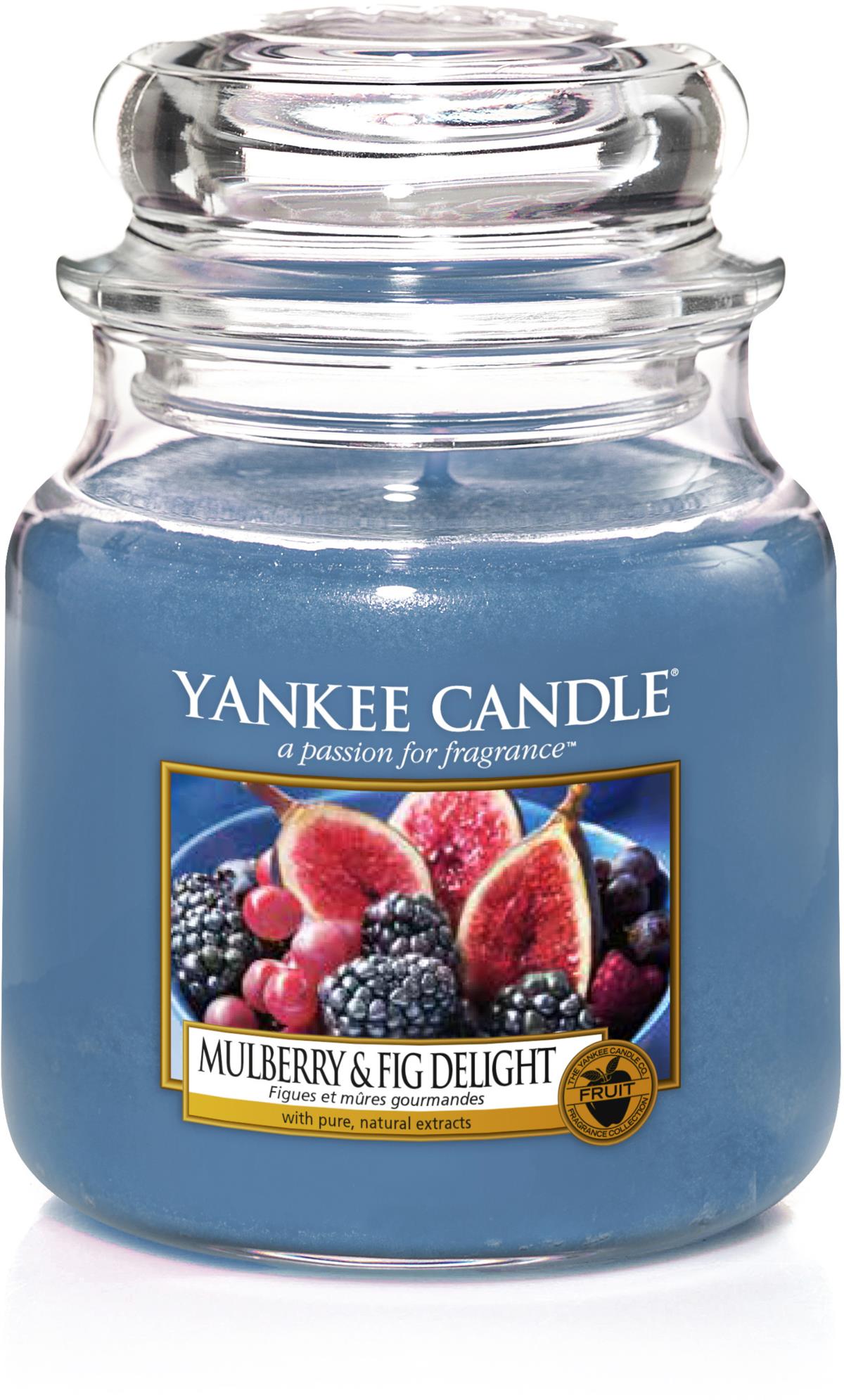 Specifications. This Yankee Candle® Mulberry & Fig Delight Jar is a candle perfect for filling spaces around your home. It is American made with the best quality ingredients from around the world. The burn time is our longest at 110-150, 65-90, and 25-30 hours; choose the right size for real-life fragrance enjoyment! This is a Fruity fragrance.